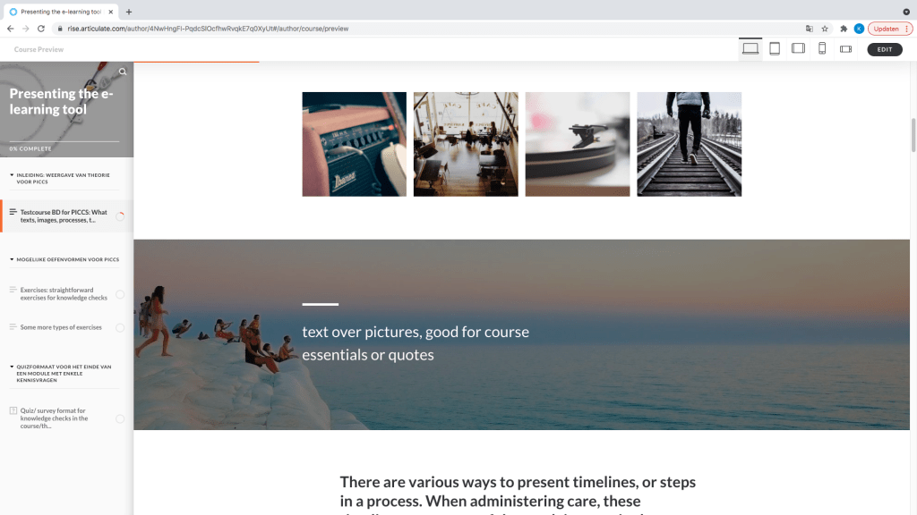 - Articulate Rise is erg laagdrempelig ook voor niet doorwinterde elearningontwikkelaars. Enkele tutorials bekijken op de site van Articulate, en je kan aan de slag.